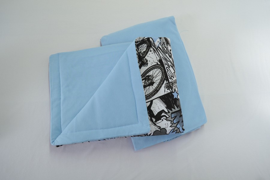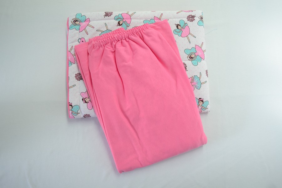 – 01 Fronha de malha 100% algodão, Fio 30/1 Penteado, com malha estampada (frente) em malha lisa (verso), Acolchoada (matelassê) com manta acrílica e três abas de 2cm.